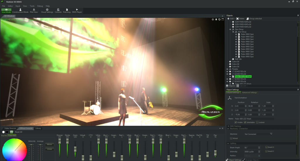 PC内の仮想空間に何百種類もの照明灯体を表示させることが出来ます。それぞれの照明灯体はパン/チルト、ゴボ、エフェクト、プリズム、アイリス、ズーム、カラーミックス(RGBAW, CMY)、各種フィルターなど様々な機能や光の質感を忠実に再現します。